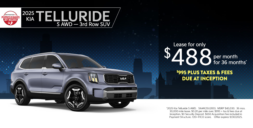 *2025 Kia Telluride S AWD. Stk#K25U3428. MSRP $43,190. 36 mos. 30,000 mile lease. $0.20 per mile over. $995 + tax & fees due at Inception. $0 Security Deposit. $650 Acquisition Fee included in Payment Structure. 720+ FICO score. Offer expires 2/2/2026.