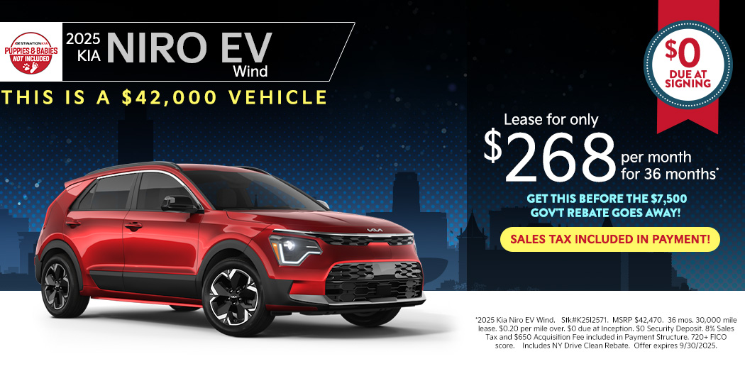 **2025 Kia Niro EV Wind. Stk#K25I3405. MSRP $42,705. 36 mos. 30,000 mile lease. $0.20 per mile over. $0 due at Inception. $0 Security Deposit. 8% Sales Tax and $650 Acquisition Fee included in Payment Structure. 720+ FICO score. Includes NY Drive Clean Rebate. Offer expires 2/2/2026.