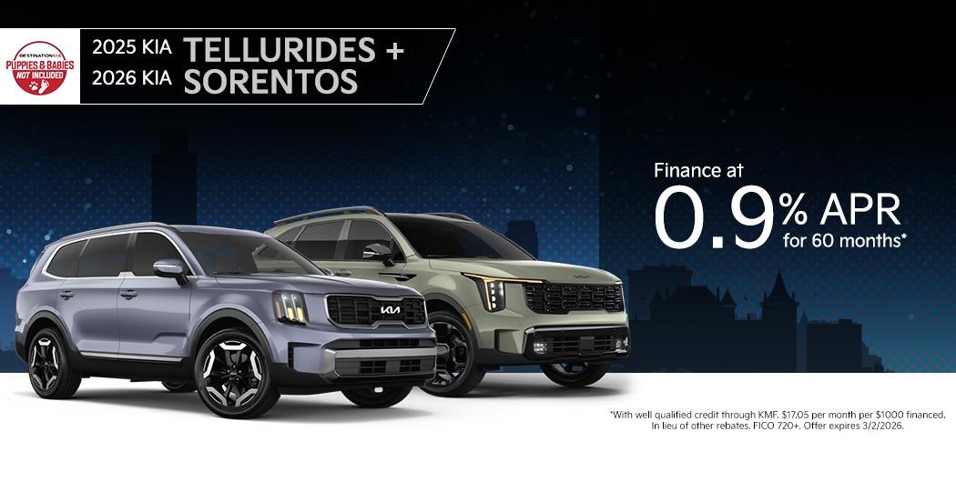 Select 2025 Kia Telluride and 2026 Kia Sorento models are available with 0.9% APR financing for 60 months, making it an ideal time to secure long-term value with a low monthly payment.