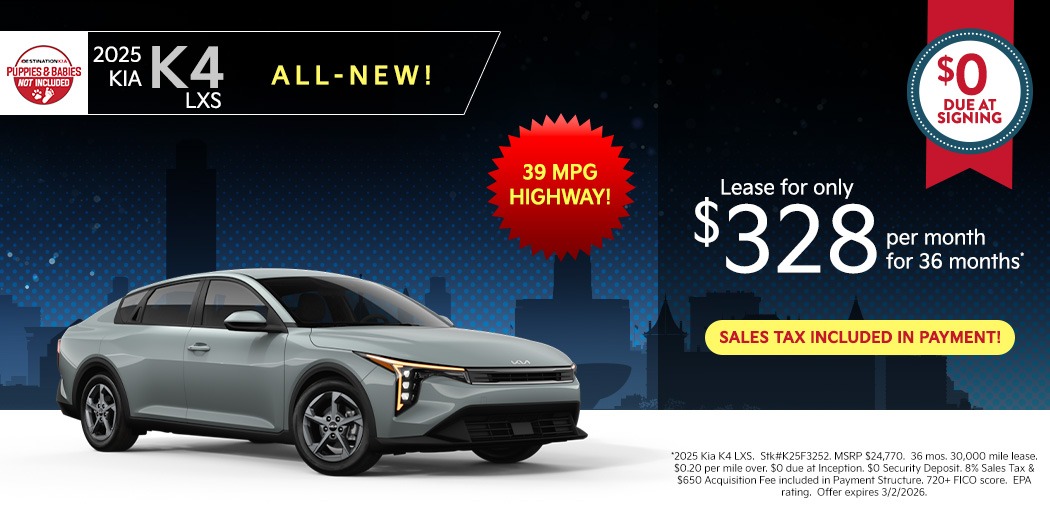 *2025 Kia K4 LXS. Stk#K25F3252. MSRP $24,770. 36 mos. 30,000 mile lease. $0.20 per mile over. $0 due at Inception. $0 Security Deposit. 8% Sales Tax & $650 Acquisition Fee included in Payment Structure. 720+ FICO score. EPA rating. Offer expires 3/2/2026.
